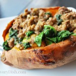 This fast, healthy meal was inspired by a breakfast recipe that I saw on the Beef It’s What’s For Dinner website for Beef & Sausage Egg Muffin Cups. They sounded great, but I was really intrigued by the Beef Sausage recipe. I tested it out in a new variation for dinner and came up with these beef sausage, kale & aged cheddar stuffed sweet potatoes. Double the beef sausage recipe and you’ll have plenty to make for breakfast, too. 🙂