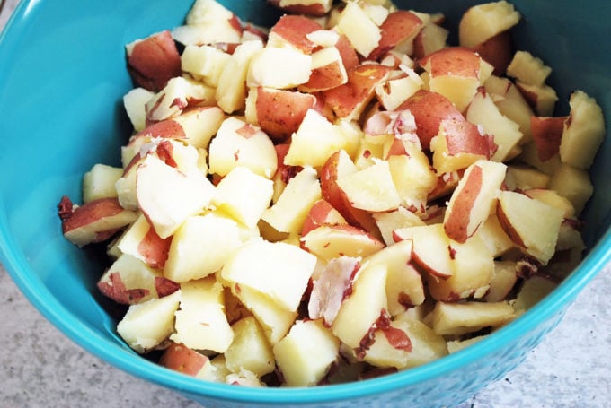 Step 2: Drain, cool, and chop potatoes. Drain the stockpot and rinse the potatoes well with cold water. Then, drain once more and set the potatoes aside. Once cooled, peel (optional!) and cube the potatoes, then place them in a large bowl.